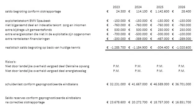 Op donderdag 8 december staat de slotrapportage 2022 van de gemeente Beek op de agenda van de raadsvergadering. Uit het niets doemt opeens een tekort op van maar liefst € 1.620.500. De in de slotrapportage opgenomen meerjarenbegroting 2023 t/m 2026 is inmiddels niet meer actueel. Met materiële zaken zoals het te verwachten exploitatietekort BMV Spaubeek, additionele rentelasten vanwege de slechte financiële positie en tekorten op het sociale domein is geen of slechts beperkt rekening gehouden. Ook de risico’s met betrekking tot voorgeschoten bedragen inzake Oekraïne opvang en energietoeslag en de kans dat de landelijke overheid deze voorgeschoten bedragen slechts deels zal compenseren zijn onderbelicht.